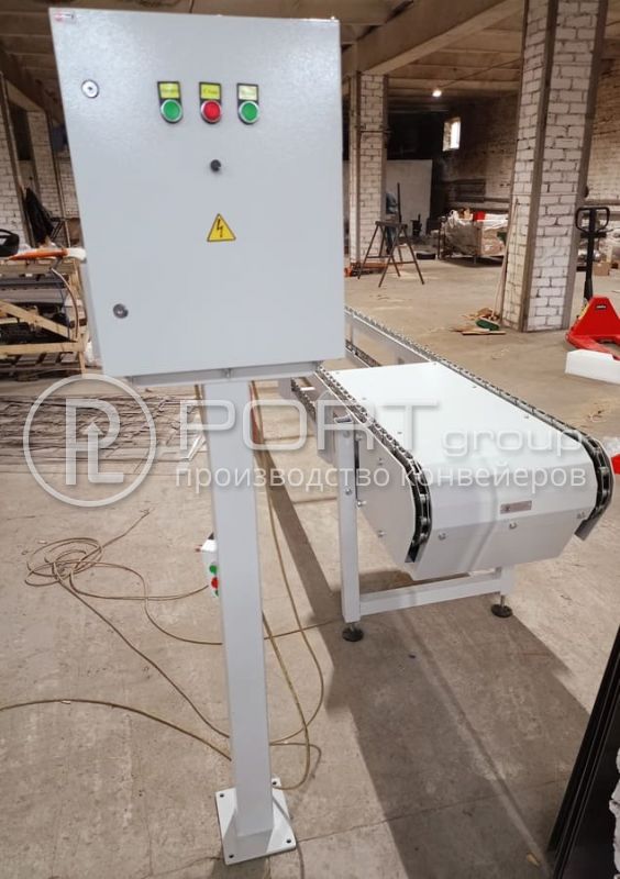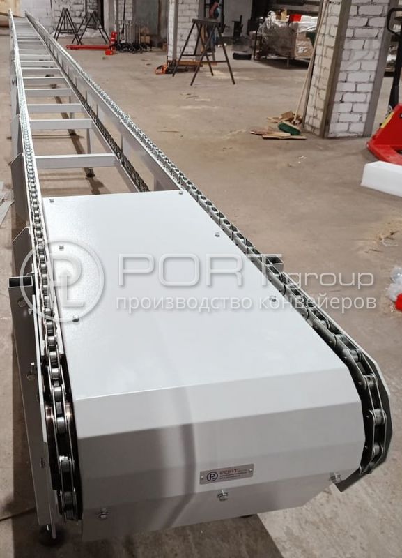 Цепные транспортеры с шириной 450 мм для перемещения грузов с цепью из нержавеющей стали. Конвейеры изготовлены по индивидуальному заказу промышленного предприятия в Московской области. Все фото (2)Цепной конвейер для паллет с готовой продукцией